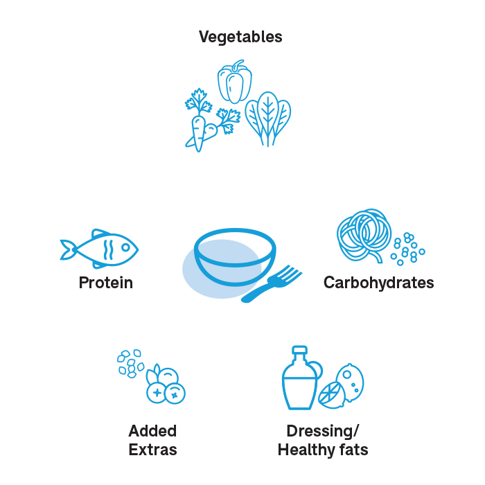 Start with a base of half a cup of wholegrains or slow-release carbs. For example: brown rice, quinoa, soba noodles, farro, freekeh, pearl barley, teff, millet, buckwheat, wild rice.