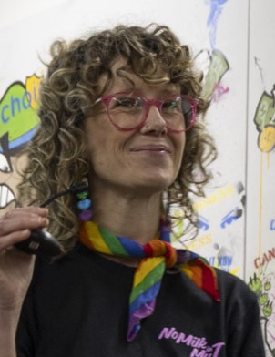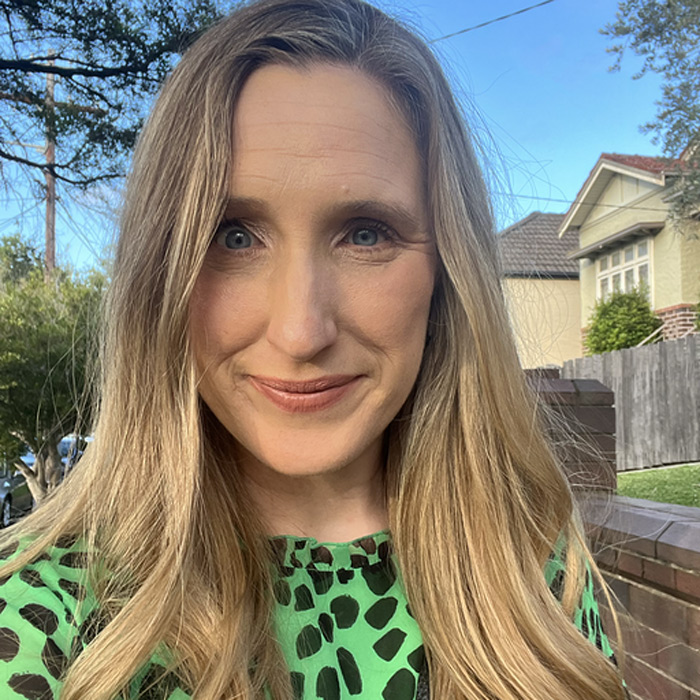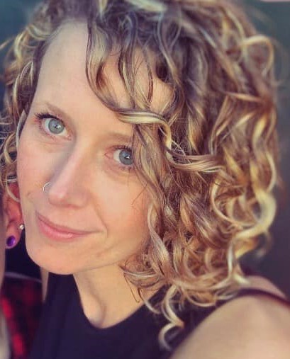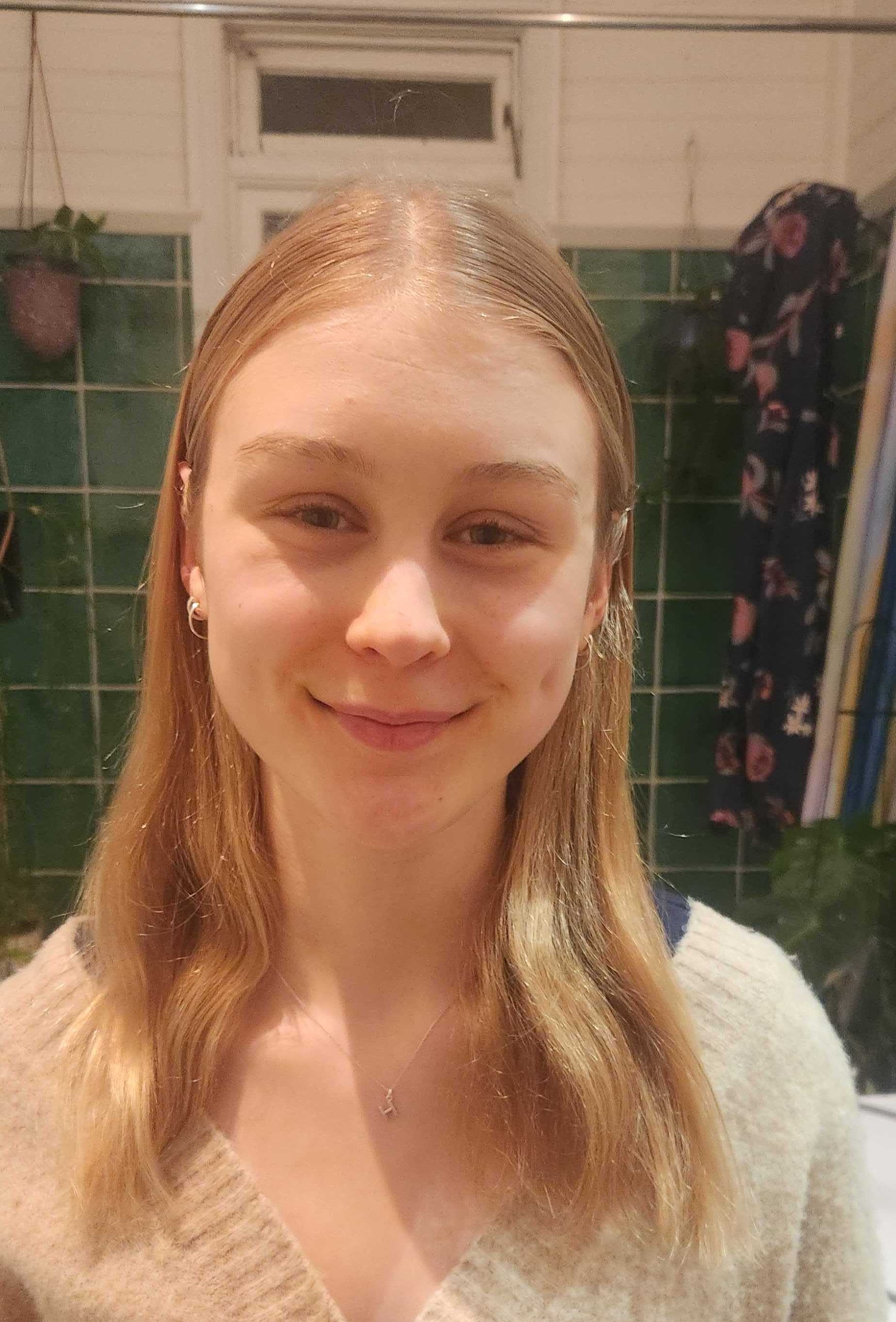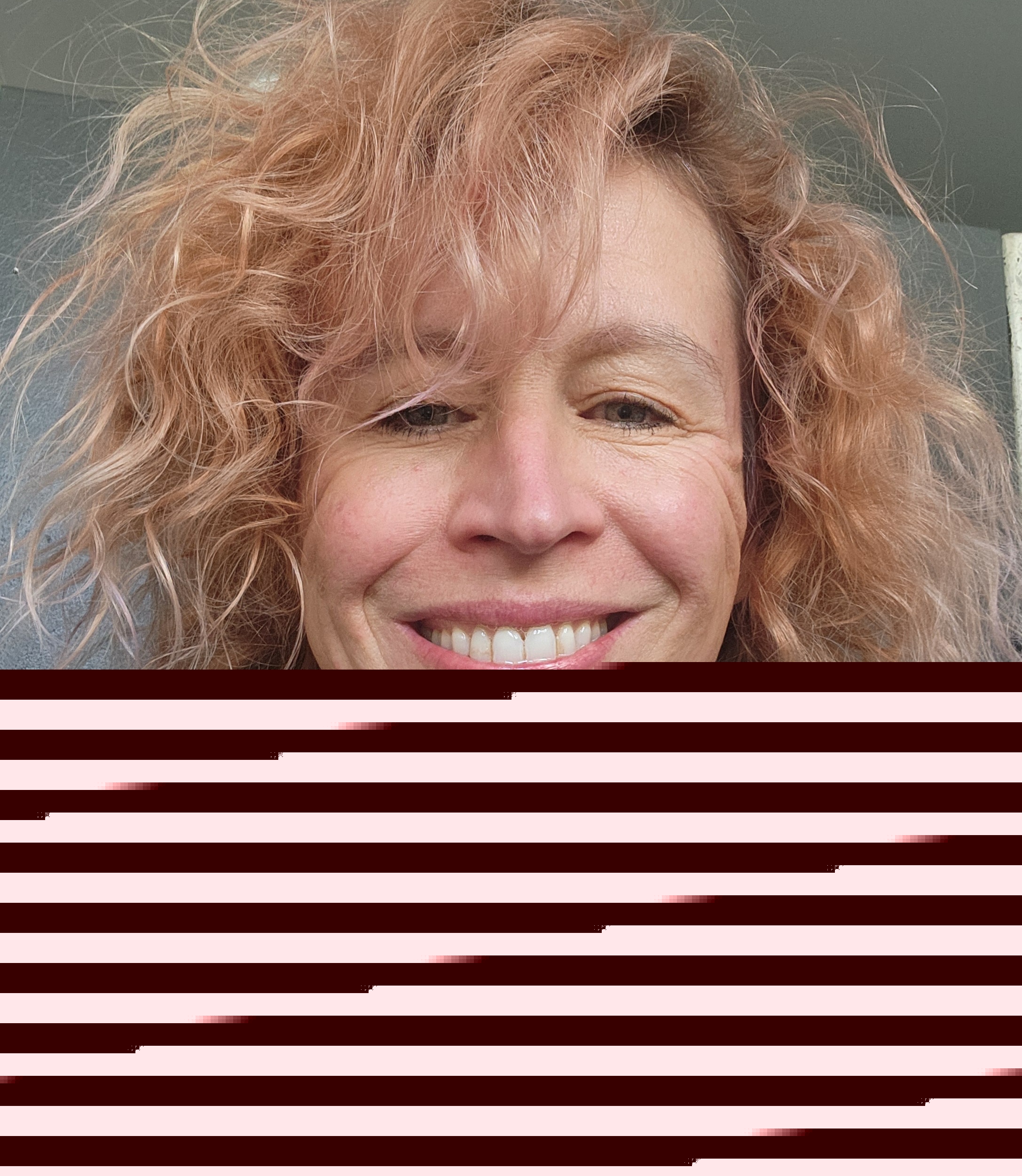 Result: a photo of the back of Alice’s head. Her shoulder-length hair is brown with blonde highlights (and lots of regrowth!) and is curly but a bit frizzy.