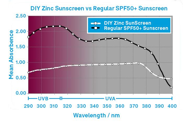 He used a typical internet recipe for a DIY zinc oxide-based sunscreen, and, with a spectrophotometer designed specifically for testing sunscreens, measured how much UV radiation the sunscreen absorbed at different wavelengths. He then compared it to a commercial SPF50+ product with the same percentage of zinc oxide (about 26%).