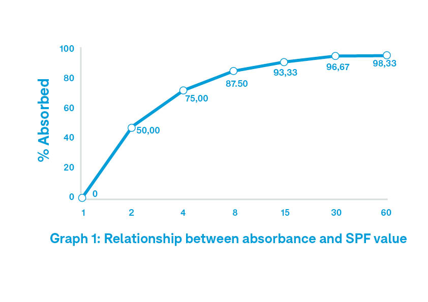 As the chart shows, the homemade version has about half the absorbance of the commercial product. That might not seem so bad, but the relationship between SPF and absorbance isn’t linear (see chart below). In this case, the homemade sunscreen had an estimated equivalent to an SPF of about 5 – despite both having the same amount of active ingredient.