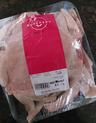 You see, I had already started rendering my own beef tallow for use as a cooking oil. Pre-made jars of tallow are expensive, but a kilo of beef fat from the butcher is usually just a few dollars. All you have to do to turn it into tallow is melt it down and sieve it.