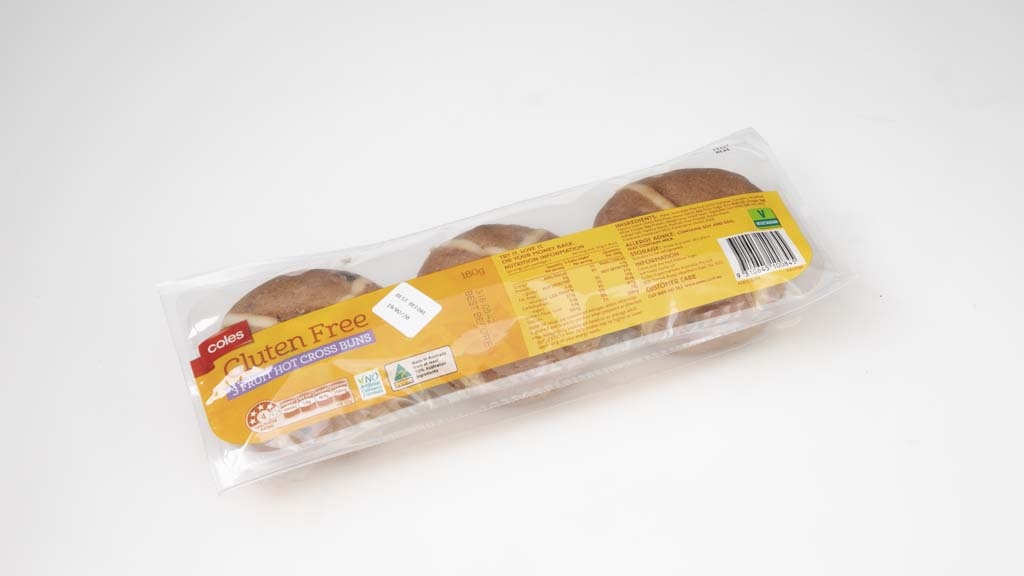 Coles Gluten Free Fruit Hot Cross Buns $3.50 per 3-pack ($1.17 per bun)