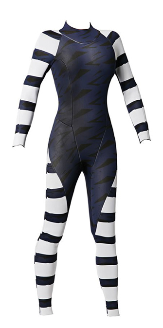 The design for divers features a camouflage pattern ($495) in various shades of blue, which Sams says makes the wearer blend into the surrounding water. There’s also a special wetsuit specifically for surfers ($495), which features black and white banding along the limbs. While it might make you look like a pedestrian crossing, Sams says the wetsuit is designed to send a warning to sharks that you’re not a yummy treat.
