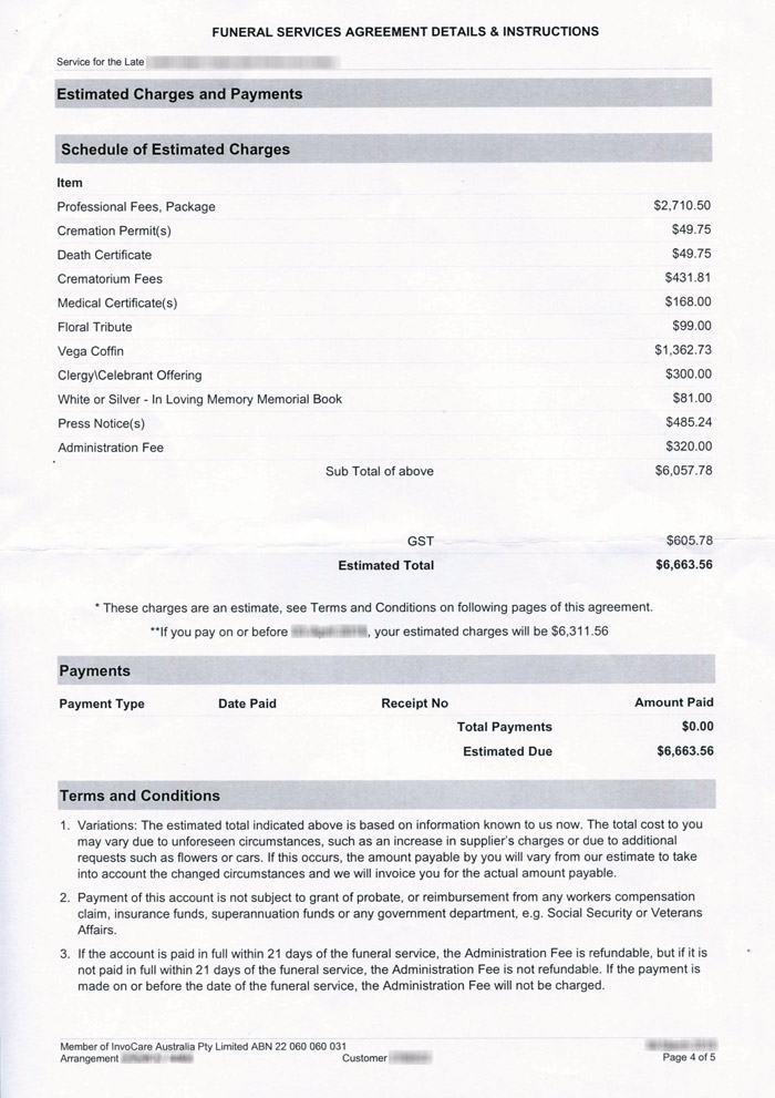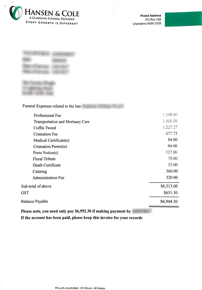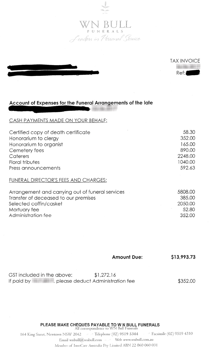 As an example, let’s take an invoice from InvoCare’s Simplicity Funerals.
