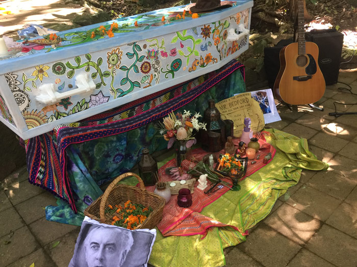 She says a funeral doesn’t need to have one person talking at the front. “A ceremony could be anything,” she says. “It could be like a feast or huge dinner party with the coffin there.”