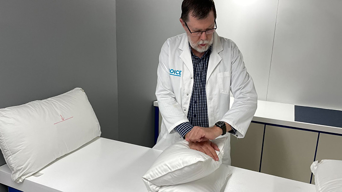 CHOICE expert Chris Barnes conducting the ‘fold test’ on a pillow.