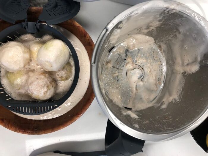 While Thermomix says you don’t need to rinse your potatoes beforehand as they’re “washed at the same time as peeling”, Fiona found she did need to rinse them afterwards to clean off a frothy sludge that was left after processing the potatoes. Thermomix says this can be reduced by adding a little oil.