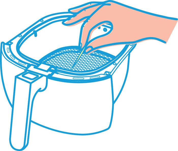 Not all air fryers have an exposed or accessible heating element, but in most cases, gently brushing with a dry cleaning brush will loosen any debris. In some cases you may be able to wipe it down with a warm, damp cloth, but we’ve seen different recommendations in manufacturers’ manuals. Some warn you not to wipe down the element at all, while others mention this is OK. As a general rule, don’t use anything harsh on the element.