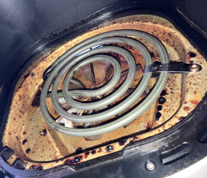 Some residue may also, over time, find itself under the element and around the fan area. Many air fryer designs make it very difficult to access these areas for cleaning, but you can wipe around these areas as best you can using a warm, damp cloth.