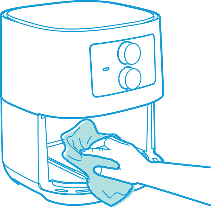 Warm, soapy water and a soft cloth/microfibre cloth are generally all you need to clean your air fryer. Never use a scourer or abrasive sponge to clean the interior as this can weaken or damage the non-stick coatings.
