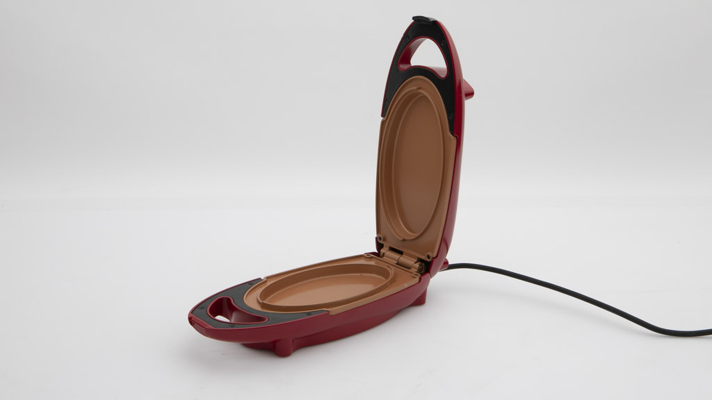 This hinged, oval-shaped device is similar to a sandwich press or waffle maker. When you switch it on, the red light illuminates, and the green light turns on once it’s been preheated.