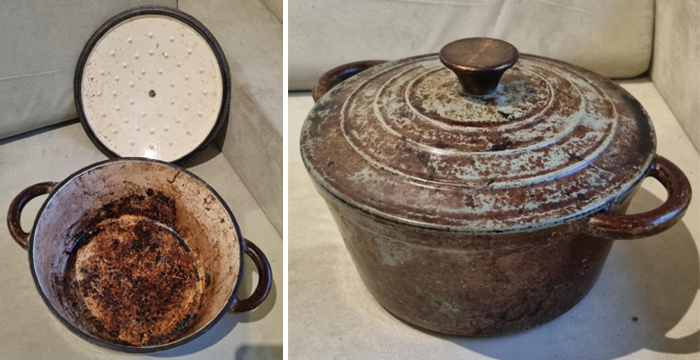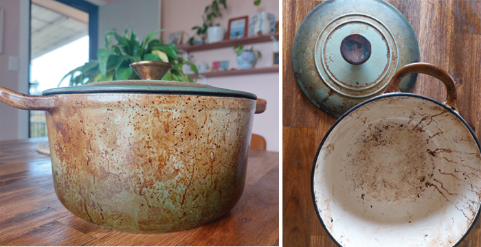 Frequently cooking sourdough in the Kmart pot seems to have caused some crazy staining – inside and out.