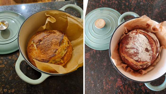 It seems I was more diligent with scoring and flouring my bread when baking in my Kmart Dutch oven a year ago (right), but the Aldi pot performed just as well (left).