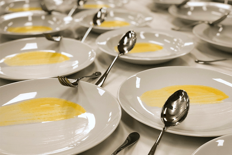 Our testers check how well the dishwashers tackle a full load of dirty dishes by measuring out and placing equal amounts of steam-baked oats, egg yolk, spinach, baby cereal, butter, tomato juice and tea on our standardised set of crockery. They also put egg yolk onto cutlery. Each of these ‘soils’ tests different aspects of the dishwasher’s performance.