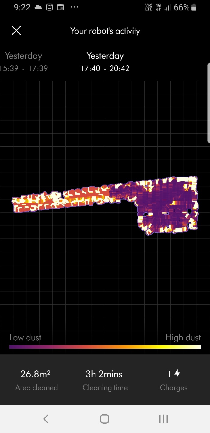 Ultimately, cleaning the floor took 28 minutes of actual cleaning time, but 3 hours and 32 minutes if you include all the battery charging.