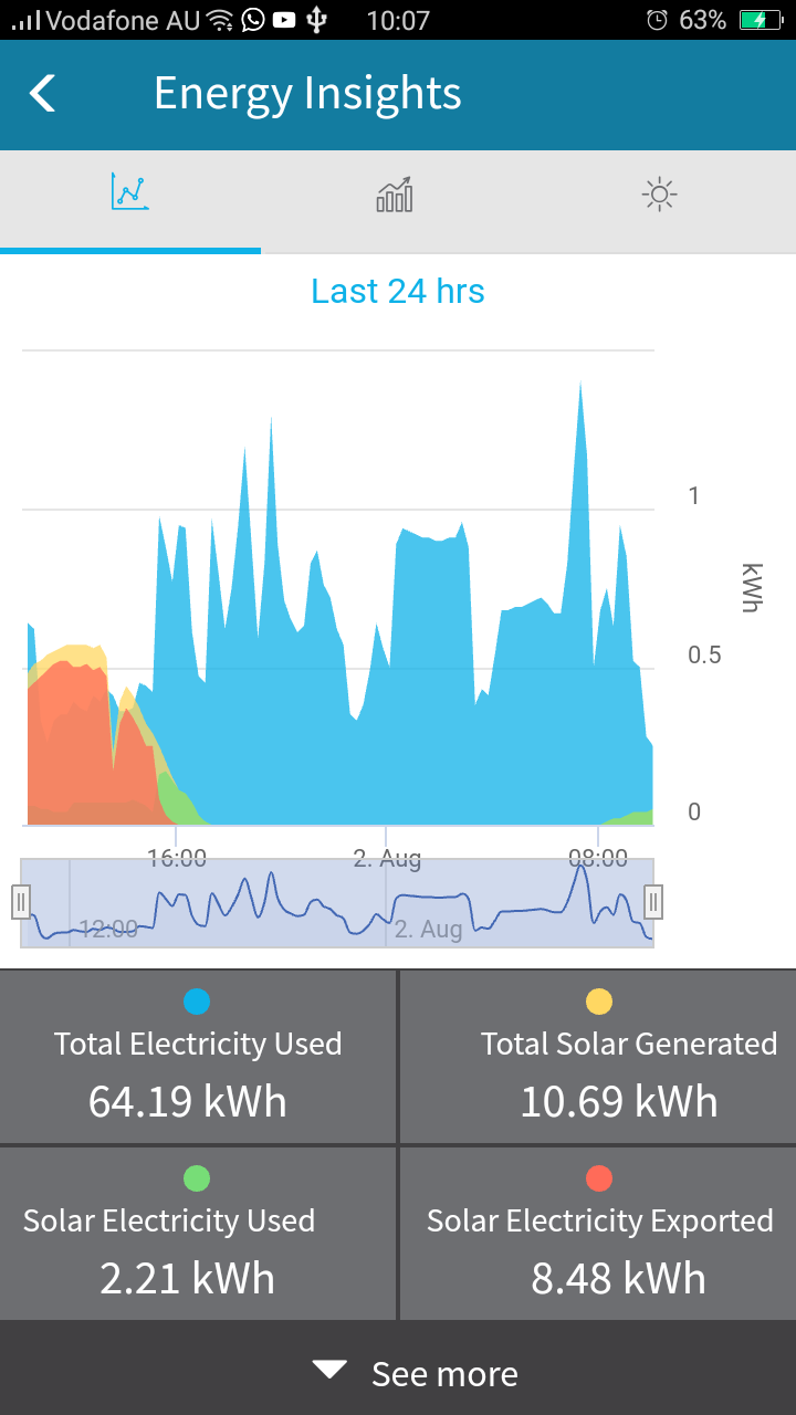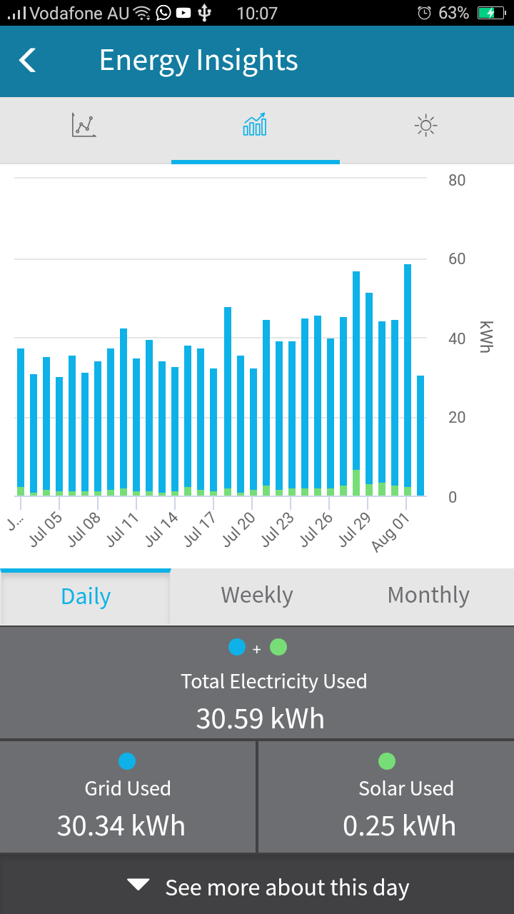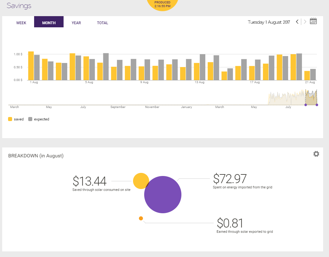 The Solar Analytics graph from the dashboard of a family home shows the daily electricity used (over a month) through each monitored circuit in the household, as well as the solar electricity produced.A snapshot from a Solar Analytics Monitoring dashboard for a motorbike retail shop. The grey bars show how much electricity the solar panels should be producing, according to the analysis of weather and other data by the SA system. The yellow bars show the actual output. Without monitoring, the deficit would not have been so obvious, except for an increase in the electricity bill. The deficit was due to a shading (overshadowing) issue, which was rectified by 18 July and performance then matched the system’s expectations.The graph shows the expected savings from the solar output (delivered through a feed-in tariff for solar sent to the grid, and solar consumed on the site avoiding drawing from the grid) and the actual savings. In this case, expected savings were more than real savings, which would indicate that the solar PV system is under-performing.