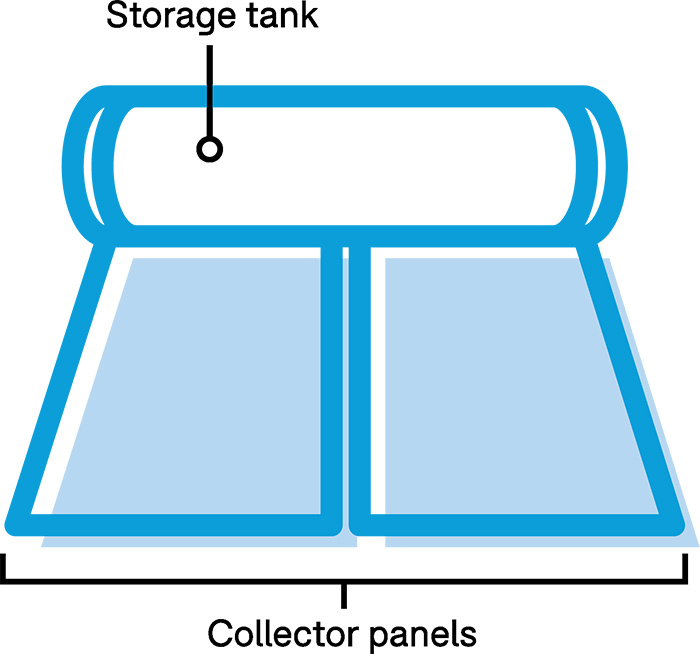 Pumped or split systems have collector panels on the roof but the tank is located at ground level (or elsewhere in the building). Hot water is pumped from the panels to the tank.