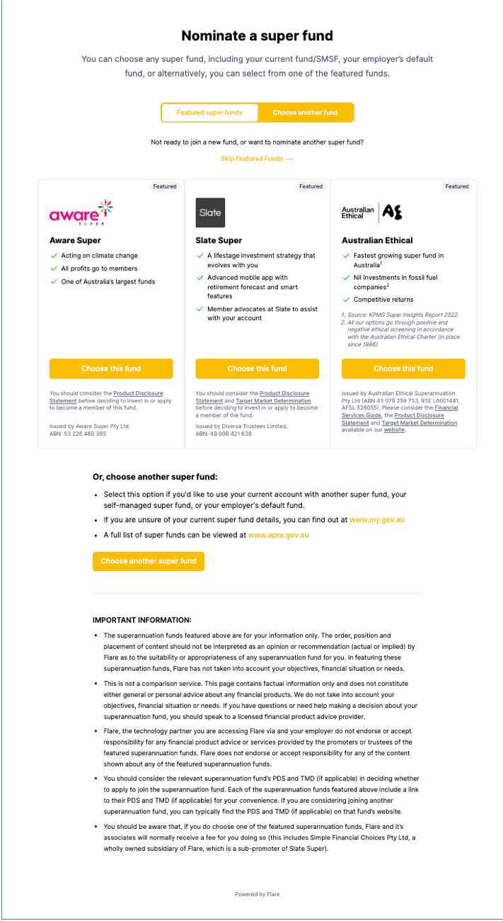 Screenshot from the MYOB onboarding software that shows how their preferred featured funds are more prominently displayed.The software asks you to nominate a fund, even if you already have one.Screenshot from MYOB onboarding software titled ‘Important information about super’.