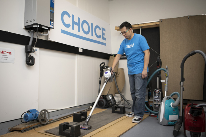 CHOICE expert Matthew Tung testing vacuum cleaners in our CHOICE labs.