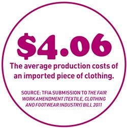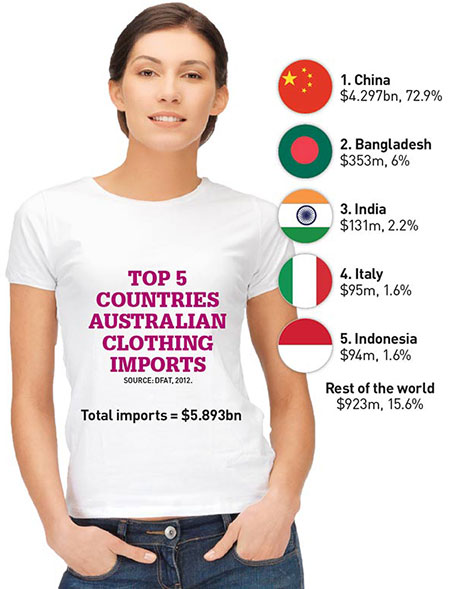 Based on value, 92% of clothes sold in Australia are imported, according to the Council of Textiles and Fashion Industries of Australia. While China still dominates the textiles market for imported clothes, imports from low-cost countries such as Bangladesh and Cambodia have been increasing at a rapid pace.