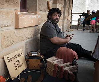 Glen Timbery sells souvenir-size throwing boomerangs for $10 that are made out of local plywood. He uses his family’s “burning-in” method to imprint each boomerang with a unique design.