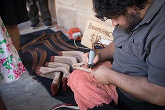 Indigenous artist Glen Timbery makes souvenir-size boomerangs out of local plywood.