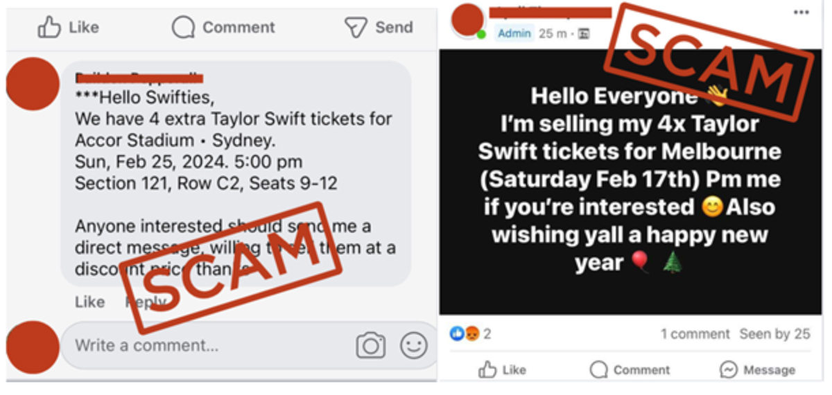 “Be mindful that scammers have been hacking genuine accounts to appear legitimate and are tricking trusting friends or connections into buying Taylor Swift tickets that don’t exist.”