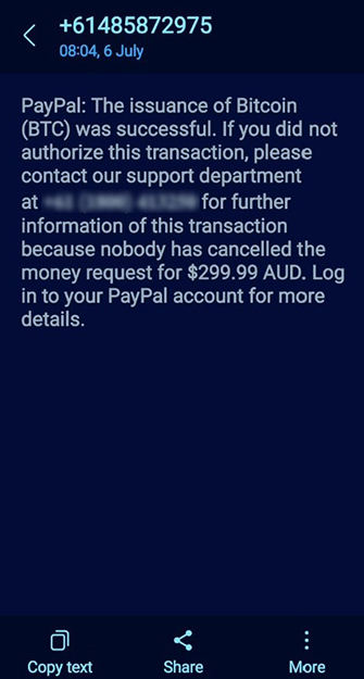 The Bitcoin text appeared to come from 0485 872 975 – the same number as these previous official PayPal messages.