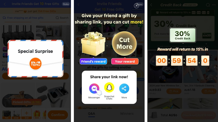 Winning in these games is often guaranteed, but there’s a big catch: you usually have to spend a minimum amount out of your own pocket or promote Temu to your friends on social media before you can unlock a prize.