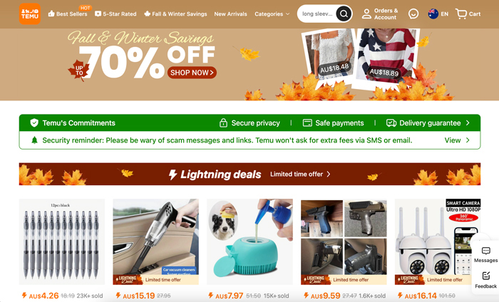 Plastered across Temu’s pages are promotions of constant sales with discounts reaching highs of over 90%, and promises of free shipping.