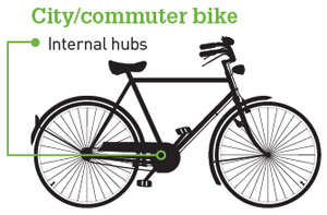 Internal hubs – where the gear system is inside a covered chamber – are a good option for everyday cyclists. They’re low maintenance, and gears can be shifted while you’re stopped. On the downside, they make it fiddly to remove the wheel if you have a flat tyre, and can be pretty bulky.