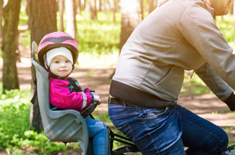 A child seat can be mounted on the front or back of your bike. Your child needs to be strong enough to wear a helmet and still keep their head upright – so we’re generally talking kids over 12 months. The seat should also have guards so their hands and feet can’t get caught in the spokes.